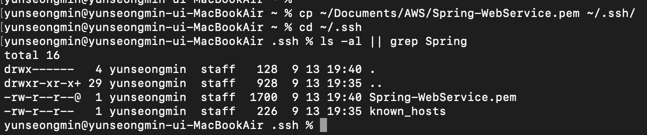 * 매번 ssh 명령어를 입력하면 너무 번거롭기 때문에 파일을 ~/.ssh/로 복사합니다.